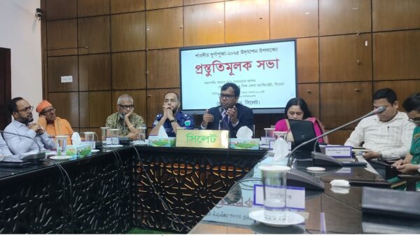 শারদীয় দুর্গাপূজা-২০২৫ উদযাপন উপলক্ষ্যে সিলেটে প্রস্তুতিমূলক সভা অনুষ্ঠিত হয়েছে। গতকাল বৃহস্পতিবার সিলেটের জেলা প্রশাসকের কার্যালয়ে সিলেটের জেলা প্রশাসক মো. সারওয়ার আলমের সভাপতিত্বে সভায় সিলেটের পুলিশ সুপার মোহাম্মদ মাহবুবুর রহমান, স্থানীয় সরকারের উপপরিচালক সুবর্ণা সরকার, অতিরিক্ত জেলা প্রশাসক (সার্বিক) পদ্মাসন সিংহ, সিলেট সিটি কর্পোরেশনের সাবেক মেয়র আরিফুল হক চৌধুরী, আইন-শৃঙ্খলা বাহিনী ও গোয়েন্দা দপ্তরের প্রতিনিধি, সিটি কর্পোরেশনের প্রতিনিধি, জেলা ও উপজেলা পর্যায়ের হিন্দু ধর্মীয় সংগঠন ও পূজা উদযাপন কমিটির সদস্যসহ বিভিন্ন রাজনৈতিক দলের নেতৃবৃন্দ উপস্থিত ছিলেন। সভায় পূজা উদযাপন কমিটির নেতৃবৃন্দ তাদের গৃহীত সিদ্ধান্ত ও চ্যালেঞ্জগুলো তুলে ধরেন। এর আলোকে তারা বিভিন্ন প্রস্তাব তুলে ধরেন। নিশ্চিন্তে ও নিরাপদে শারদীয় দুর্গাপূজা উদযাপনে তারা প্রশাসন, পুলিশ ও রাজনৈতিক দলসহ ধর্ম-বর্ণ নির্বিশেষে সকলের সহযোগিতা কামনা করেন। সভায় জেলা প্রশাসক নির্বিঘেœ পূজা উদযাপনে ও পূজামন্ডপের নিরাপত্তা নিশ্চিতকরণে প্রত্যেক পূজামন্ডপে সিসি ক্যামেরা স্থাপন, চেকপোস্টের মাধ্যমে সার্বক্ষনিক তল্লাশি কার্যক্রম বজায় রাখা ও দায়িত্বশীল স্বেচ্ছাসেবী নিয়োগের বিষয়ে গুরুত্ব দেন। তিনি বলেন ধর্মীয় সম্প্রীতির দিক থেকে সিলেট অনন্য। এই ধারাবাহিকতা বজায় রেখে সকলের সহযোগিতায় সিলেটে উৎসবমুখর পরিবেশে এবারের দুর্গাপূজা পালিত হবে। যে কোন অপ্রীতিকর ঘটনা এড়াতে সবাইকে সজাগ থাকার পাশাপাশি তিনি সব ধরণের গুজব প্রতিহত করার পরামর্শ দেন। কোন বিষয় সম্পর্কে নিশ্চিত না হয়ে সামাজিক যোগাযোগ মাধ্যম বা অন্য কোন মাধ্যমে তা প্রচার করা থেকে বিরত থাকার অনুরোধ জানান। এছাড়া তিনি প্রশাসন, পুলিশ, আইন-শৃঙ্খলা বাহিনী ও নাগরিক সমাজের প্রতিনিধিদের সমন্বয়ে মনিটরিং সেল গঠনের মাধ্যমে পূজামন্ডপের নিরাপত্তা নিশ্চিতের আশ্বাস প্রদান করেন। সভায় আইন-শৃঙ্খলা ও গোয়েন্দা দপ্তরের প্রতিনিধিরা সবগুলো পূজামন্ডপ গোয়েন্দা নজরদারিতে রাখা হবে বলে জানান। এছাড়া সিলেট মেট্রোপলিটন পুলিশের মোবাইল টিম দিন-রাত টহল পরিচালনা করবে বলে জানানো হয়। সীমান্তবর্তী পূজামন্ডপগুলোর নিরাপত্তা নিশ্চিতে বিভিন্ন পদক্ষেপ নেওয়া হয়েছে বলে জানায় বর্ডার গার্ড বাংলাদেশ (বিজিবি)। উল্লেখ্য দুর্গাপূজা উদযাপন উপলক্ষ্যে সিলেট সিটি কর্পোরেশনের পক্ষ থেকে কন্ট্রোল রুম খোলা হবে যা ২৪ ঘণ্টা কার্যকর থাকবে। (বিজ্ঞপ্তি)