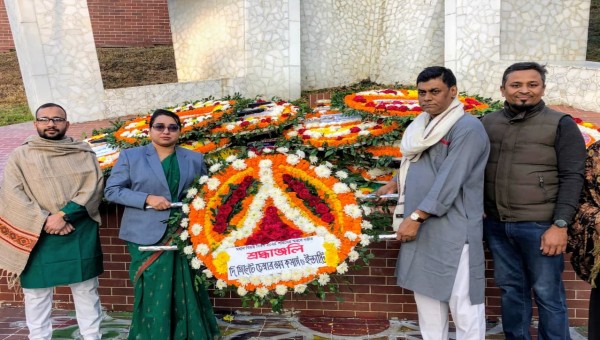 মহান বিজয় দিবস-২০২৫ উপলক্ষ্যে দি সিলেট চেম্বার অব কমার্স এন্ড ইন্ডাস্ট্রি’র পক্ষ থেকে ১৬ ডিসেম্বর সকালে সিলেট কেন্দ্রীয় শহীদ মিনারে পুষ্পস্তবক অর্পণের মাধ্যমে মহান স্বাধীনতাযুদ্ধের শহীদগণের প্রতি গভীর শ্রদ্ধা নিবেদন করেন সিলেট চেম্বার অব কমার্সের প্রশাসক ও কর্মকর্তাবৃন্দ। এসময় একাত্তরের মহান মুক্তিযুদ্ধে শহীদ বীর মুক্তিযোদ্ধা ও লাখো বাঙালি শহীদগণের আত্মার মাগফেরাত কামনা করেন তারা। পুষ্পস্তবক অর্পণকালে উপস্থিত ছিলেন সিলেটের অতিরিক্ত জেলা ম্যাজিস্ট্রেট ও দি সিলেট চেম্বার অব কমার্স এন্ড ইন্ডাস্ট্রি’র প্রশাসক সাঈদা পারভীন, চেম্বারের নির্বাহী সচিব মোঃ গোলাম আক্তার ফারুক, উপ-নির্বাহী সচিব সানু উদ্দিন রুবেল, এক্সিকিউটিভ অফিসার মোঃ ইমরান হোসেন, পাবলিক রিলেশন অফিসার ইউনা আলম প্রমুখ।