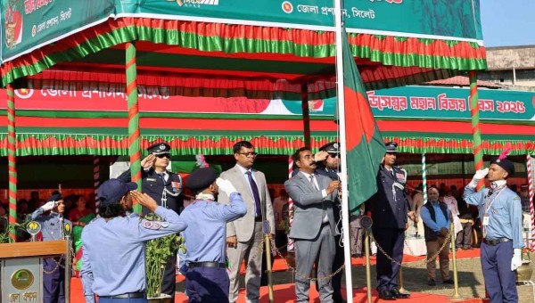 সিলেটে যথাযোগ্য মর্যাদায় মহান বিজয় দিবস পালিত হয়েছে। দিবসটি উদ্যাপন উপলক্ষ্যে সূর্যোদয়ের সাথে সাথে জেলা প্রশাসক কার্যালয় প্রাঙ্গণে ৩১ বার তোপধ্বনি, কেন্দ্রীয় শহিদ মিনারে পুষ্পস্তবক অর্পণ ও সিলেট জেলা স্টেডিয়ামে জাতীয় পতাকা উত্তোলন, জাতীয় সংগীত পরিবেশন এবং বিভিন্ন বাহিনী ও স্কুল কলেজের শিক্ষার্থীদের অংশগ্রহণে কুচকাওয়াজ ও দেশাত্ববোধক ডিসপ্লে প্রদর্শন করা হয়৷ সিলেট জেলা প্রশাসক মো. সারওয়ার আলমের সভাপতিত্বে কুচকাওয়াজ ও ডিসপ্লে প্রদর্শন অনুষ্ঠানে প্রধান অতিথি হিসেবে উপস্থিত ছিলেন বিভাগীয় কমিশনার খান মো. রেজা-উন-নবী। প্রধান অতিথির বক্তৃতায় বিভাগীয় কমিশনার বলেন, স্বাধীনতা পরবর্তী অর্ধ শতাব্দীর অধিক সময়কালের শাসনতান্ত্রিক ব্যবস্থার সকল প্রতিকূলতা, প্রতিবন্ধকতা ও ব্যর্থতাকে অতিক্রম করে গভীর দেশপ্রেম, জাতীয় ঐক্য এবং রাষ্ট্র সংস্কারের চেতনায় উজ্জীবিত হয়ে দারিদ্য বিমোচন, অর্থনৈতিক উন্নয়ন, খাদ্য নিরাপত্তা, সুশাসন, নারীর ক্ষমতায়ন ও সকলের জন্য মানসম্মত শিক্ষাসহ মৌলিক অধিকারসমূহ নিশ্চিতকরণের মাধ্যমে স্বনির্ভর বাংলাদেশ গঠনের লক্ষ্যে বর্তমান অন্তর্বর্তীকালীন সরকারের নেতৃত্বে বাংলাদেশ এগিয়ে যাচ্ছে। সরকারের সঠিক অর্থনৈতিক ব্যবস্থাপনা ও সময়োচিত সংস্কারমূলক পদক্ষেপের কারণে বাংলাদেশের সামষ্টিক ও ব্যাষ্টিক অর্থনীতি স্থিতিশীল রয়েছে। কাঙ্ক্ষিত অর্থনৈতিক প্রবৃদ্ধি অর্জনের মাধ্যমে বাংলাদেশকে অর্থনৈতিকভাবে স্বনির্ভর দেশ হিসেবে গড়ে তোলার লক্ষ্যে ঐক্যবদ্ধভাবে স্ব স্ব দায়িত্ব ও কর্তব্য পালনে আত্মনিয়োগ করাই হবে এ মুহূর্তে আমাদের সবচেয়ে গুরুত্বপূর্ণ কাজ।