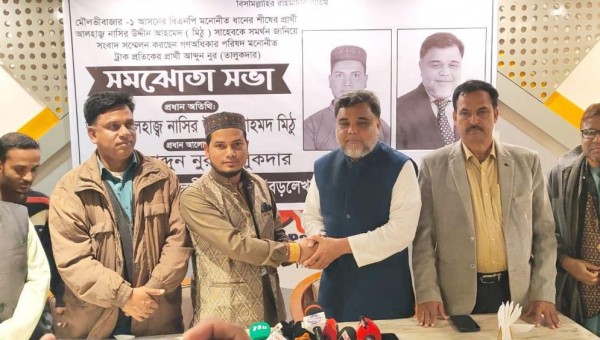 মৌলভীবাজার-১ (বড়লেখা ও জুড়ী) আসনের বিএনপির সংসদ সদস্য প্রার্থী নাসির উদ্দিন আহমেদকে পূর্ণাঙ্গ সমর্থন জানিয়েছেন গণঅধিকার পরিষদের প্রার্থী আব্দুন নূর তালুকদার। ধানের শীষকে বিজয়ী করতে সর্বাত্মক সহযোগিতার আশ্বাস দিয়েছেন তিনি। শুক্রবার (৬ ফেব্রুয়ারি) রাতে বড়লেখা পৌরশহরের একটি রেস্টুরেন্টে দুই প্রার্থীর সমঝোতা হয়। এতে গণঅধিকার পরিষদের কেন্দ্রীয় কর্মসূচি ও নিরাপত্তা বিষয়ক সহ-সম্পাদক আব্দুন নূর তালুকদার ঘোষণা দিয়ে বলেন, ধানের শীষকে বিজয়ী করতে আমি ও আমার দলের কর্মী-সমর্থকরা নাসির উদ্দিন আহমেদ ও তার দলীয় নেতাকর্মী এবং সমর্থকদের কাঁধে কাঁধ মিলিয়ে ভোটারের সমর্থন আদায়ে মাঠে থাকবেন। তিনি জানান, নতুন দলের তরুণ সংসদ সদস্য প্রার্থী হিসেবে দিনরাত কাজ করে যাচ্ছেন তিনি। ট্রাক প্রতীকের গণসংযোগ ও প্রচারণা করতে গিয়ে দেখেছেন, অনুভব করেছেন মানুষ পরিবর্তনের ডাকে সাড়া দিচ্ছে, এই বার্তাকে গ্রহণ করছেন। আগামীর বাংলাদেশ গড়ার সংস্কার কার্যক্রমগুলো বিএনপি-গণঅধিকার পরিষদের লক্ষ্য এক ও অভিন্ন। নূর তালুকদার বলেন, গণঅধিকার পরিষদের সভাপতি নুরুল হক নুরের সঙ্গে বিএনপির আগে থেকেই সমঝোতা রয়েছে। তা অনুসরণ ও সম্মান জানিয়ে আমি বিএনপি প্রার্থীর বিজয় নিশ্চিত করতে তাকে সমর্থন জানাচ্ছি। তবে ধানের শীষের বিজয়ের পরে নাসির উদ্দিন আহমেদ যেন তার (আব্দুন নূর তালুকদার ঘোষিত) নির্বাচনি ইশতেহার বাস্তবায়নে সর্বোচ্চ গুরুত্ব দেন। নাসির উদ্দিন আহমেদ জানান, নূর তালুকদারের বিএনপির প্রতি এ সমর্থনের যথাযথ মূল্যায়ন করা হবে। সব নির্বাচনি কর্মকাণ্ডে তাকে সম্পৃক্ত ও আগামীর বড়লেখা ও জুড়ী উপজেলা বিনির্মাণে অংশীদারিত্ব দেওয়ার প্রতিশ্রুতি প্রদান করেন। সভায় উপস্থিত ছিলেন- বিএনপি প্রার্থীর নির্বাচন পরিচালনা কমিটির আহ্বায়ক ও উপজেলা বিএনপির সাবেক আহ্বায়ক জয়নাল আবেদীন, সদস্য সচিব ও উপজেলা বিএনপির সাধারণ সম্পাদক মুজিবুর রহমান খছরু, প্রবাসী বিএনপি নেতা আব্দুস সহিদ, মৌলভীবাজার জেলা গণঅধিকার পরিষদের সহ-সভাপতি বদরুল ইসলাম, ছাত্রঅধিকার পরিষদের সাধারণ সম্পাদক হাফিজ সুমন আহমদ, যুগ্ম সাধারণ সম্পাদক আব্দুস সামাদ, বড়লেখা উপজেলা ছাত্রঅধিকার পরিষদের সদস্য রায়হান আহমদ প্রমুখ।