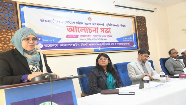 তারুণ্যনির্ভর নতুন বাংলাদেশ গঠনে সিলেটে জেলা তথ্য অফিসে আয়োজনে ‘এসো দেশ বদলাই, পৃথিবী বদলাই’ শীর্ষক আলোচনা সভা অনুষ্ঠিত হয়েছে। সিলেট যুব উন্নয়ন অধিদপ্তরের যুব প্রশিক্ষণ কেন্দ্রের হলরুমে বুধবার (৩ ডিসেম্বর) এ সভা অনুষ্ঠিত হয়। সিলেট কৃষি বিপণন অধিদপ্তরের উপপরিচালক জুলিয়া যেসমিন মিলির সভাপতিত্বে এ আলোচনা সভায় প্রধান অতিথি হিসেবে উপস্থিত ছিলেন লিডিং ইউনিভার্সিটির উপাচার্য অধ্যাপক ড. মোহাম্মদ তাজ উদ্দিন।