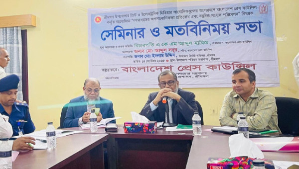 মৌলভীবাজার জেলার শ্রীমঙ্গল উপজেলায় বাংলাদেশ প্রেস কাউন্সিলের আয়োজনে ‘গণমাধ্যমের অপ-সাংবাদিকতা প্রতিরোধ এবং বস্তুনিষ্ঠ সংবাদ পরিবেশন’ শীর্ষক সেমিনার ও মতবিনিময় সভা অনুষ্ঠিত হয়েছে। আজ রবিবার (১৪ সেপ্টেম্বর) সকাল ১০টায় শ্রীমঙ্গল পৌরসভা মিলনায়তনে এই সেমিনার অনুষ্ঠিত হয়। তথ্য ও সম্প্রচার মন্ত্রণালয়ের সার্বিক সহযোগিতায় এবং শ্রীমঙ্গল উপজেলা প্রশাসনের সমন্বয়ে আয়োজিত এ অনুষ্ঠানে অংশ নেন প্রিন্ট ও ইলেকট্রনিক মিডিয়ার সাংবাদিকগণ। অনুষ্ঠানে সভাপতিত্ব করেন শ্রীমঙ্গল উপজেলা নির্বাহী কর্মকর্তা ইসলাম উদ্দিন। মূখ্য আলোচক ও প্রধান অতিথি হিসেবে উপস্থিত ছিলেন বাংলাদেশ প্রেস কাউন্সিলের চেয়ারম্যান ও সাবেক বিচারপতি এ কে এম আব্দুল হাকিম। আলোচক হিসেবে বক্তব্য দেন প্রেস কাউন্সিলের সচিব মো. আব্দুল সবুর এবং বিশেষ অতিথি ছিলেন শ্রীমঙ্গল থানার উপ-পরিদর্শক নৃপেন্দ্র বিশ্বাস। সভায় প্রধান অতিথির বক্তব্যে বিচারপতি এ কে এম আব্দুল হাকিম বলেন, ‘অপ-সাংবাদিকতা গণতন্ত্র ও সমাজের জন্য হুমকি। এ অবস্থার পরিবর্তনে সাংবাদিকদের তালিকা প্রণয়ন এবং শিক্ষাগত যোগ্যতা নির্ধারণ করে নীতিমালা তৈরি করা হয়েছে, যা সরকারের অনুমোদনের অপেক্ষায় রয়েছে।’ তিনি আরো বলেন, ‘হলুদ সাংবাদিকতা রাষ্ট্র ও সমাজকে বিভ্রান্ত করে। গণমাধ্যমের প্রতি মানুষের আস্থা ধরে রাখতে হলে সাংবাদিকদের বস্তুনিষ্ঠতা বজায় রেখে সত্য ও তথ্যনির্ভর সংবাদ পরিবেশন করতে হবে। সাংবাদিকতা শুধু পেশা নয়, এটি সামাজিক দায়বদ্ধতার ক্ষেত্র।’ সেমিনারে বক্তারা সাংবাদিকতার নৈতিকতা, তথ্য যাচাইয়ের প্রয়োজনীয়তা এবং অপ-সাংবাদিকতা থেকে বিরত থাকার উপায় নিয়ে মতবিনিময় করেন।