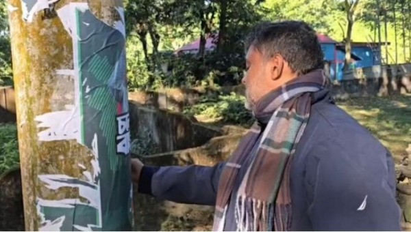 শুক্রবার (১২ ডিসেম্বর) সকালে দিরাই পৌরসভা পয়েন্টে নিজ পোস্টার নিজেই খুলে ফেলেন দাঁড়িপাল্লা প্রতীকের এই প্রার্থী।